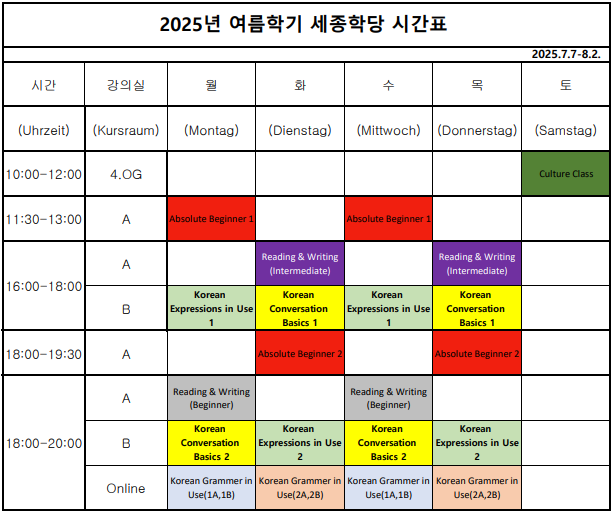 - Korean Conversation Basics 1 Di, Do 16:00-18:00 (Raum B)